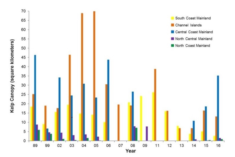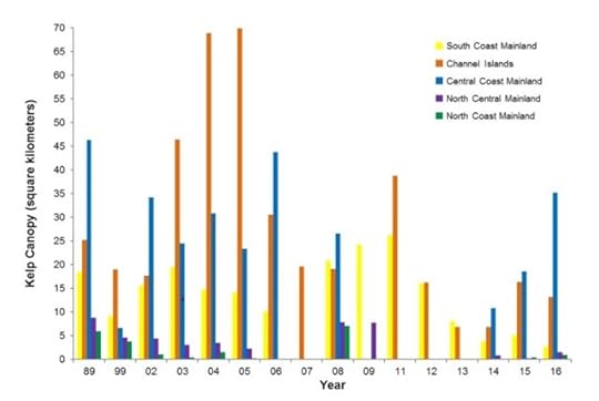 This chart shows a worrying trend. If 1989 / 1999 are the baseline definition of "normal" kelp cover, then the Channel Islands (in Southern California) and the Central Coast have been doing relatively well, while the North Coast and North Central areas are suffering badly, especially since 2009.