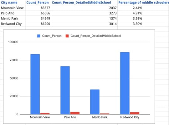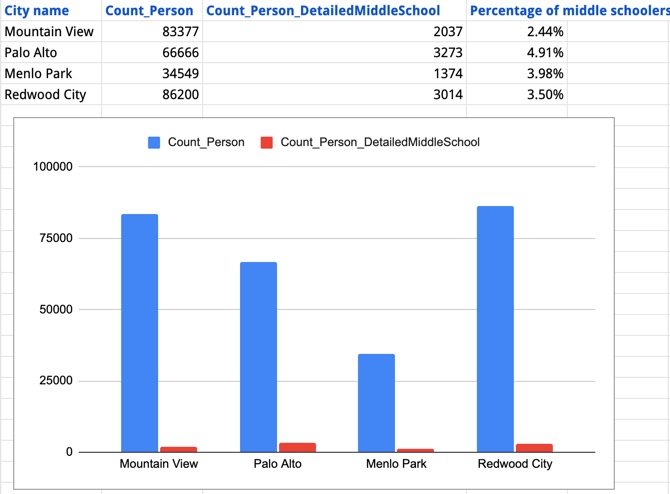 Finally, I made a quick bar chart to show the size of each city's population and the size of each city's middle-schoolers. Sweet. (Total time: around 2 minutes.)