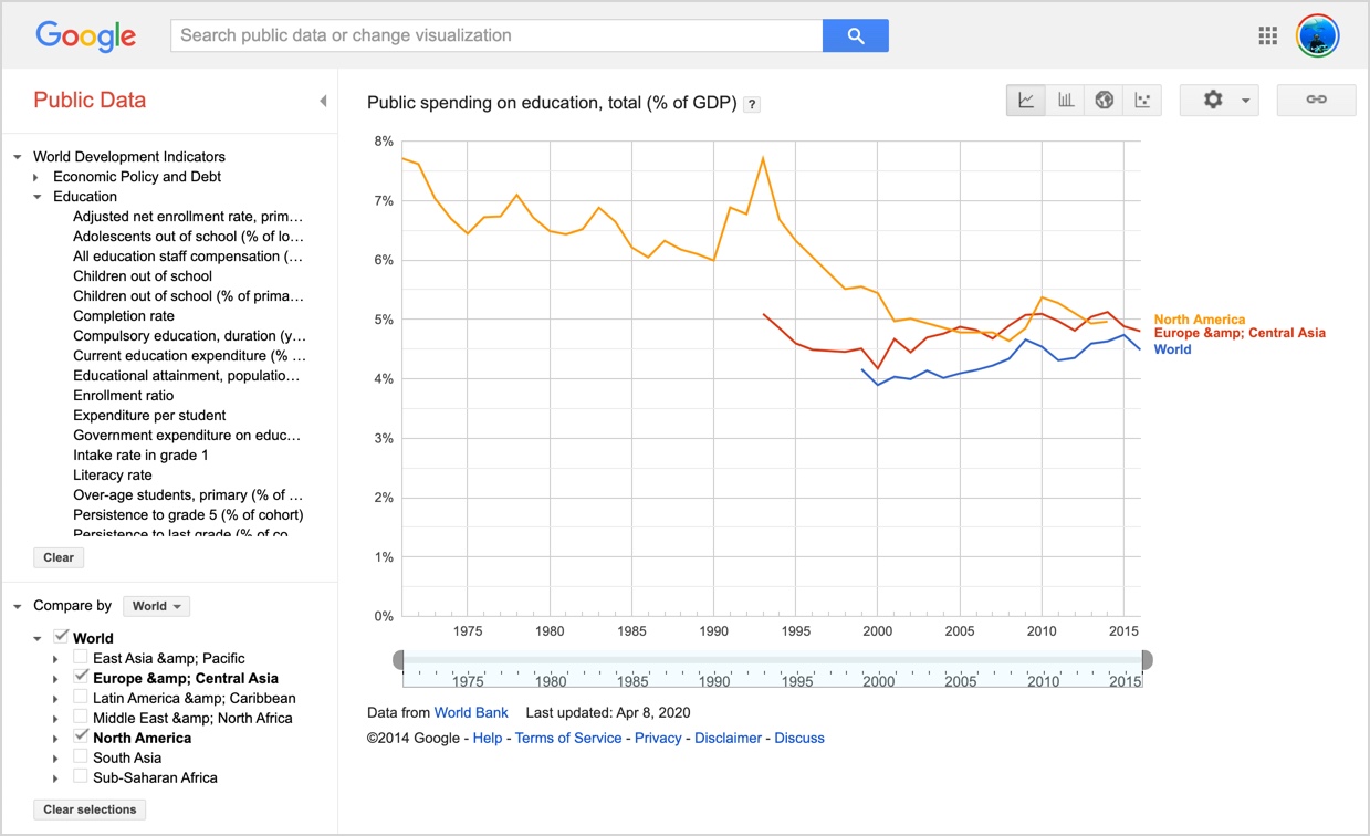 PDE has a number of data sources you can explore with visualizations, etc. Such as this fairly sobering chart of spending on education over time.