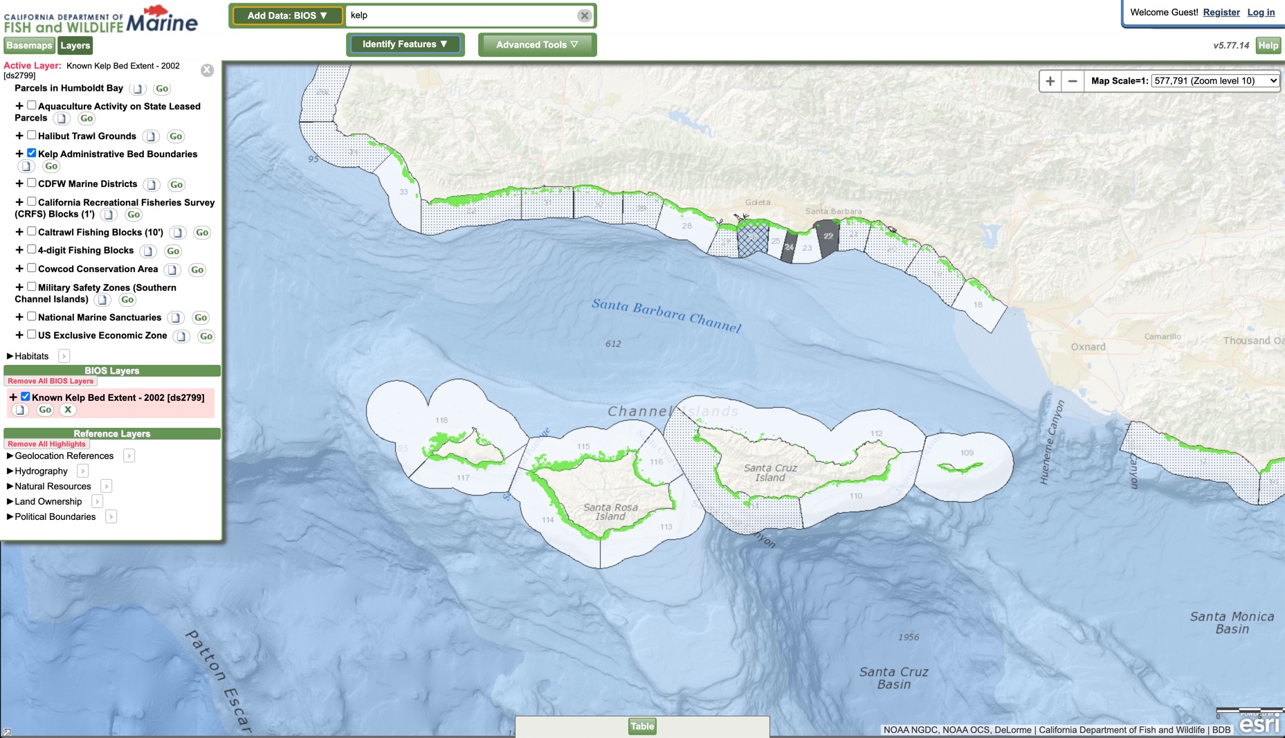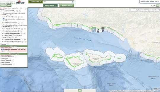 Even better, that data comes with a viewer that lets you load in the data of a given year and visualize it on the map of California coastal waters. Here's what that looks like for the kelp survey data from 2002, a fairly "normal" year (check out 2002 in the above chart).