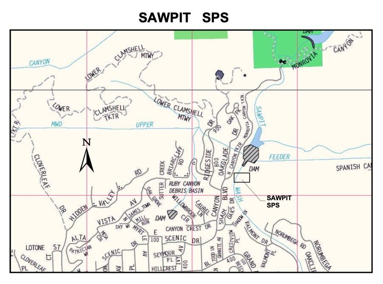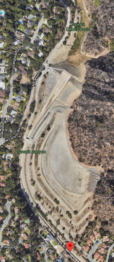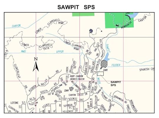 This shows the Sawpit Sediment Placement Site (SPS), the Sawpit debris basin, and the Sawpit dam way up at the north. The northern Sawpit dam is no longer in use (which is why it's not on the list of LA dams), but what looks like a dam (and is marked as a dam in this map), is actually a debris basin.