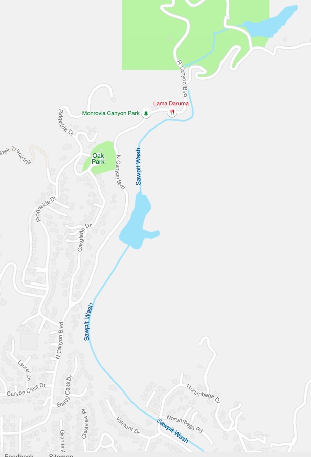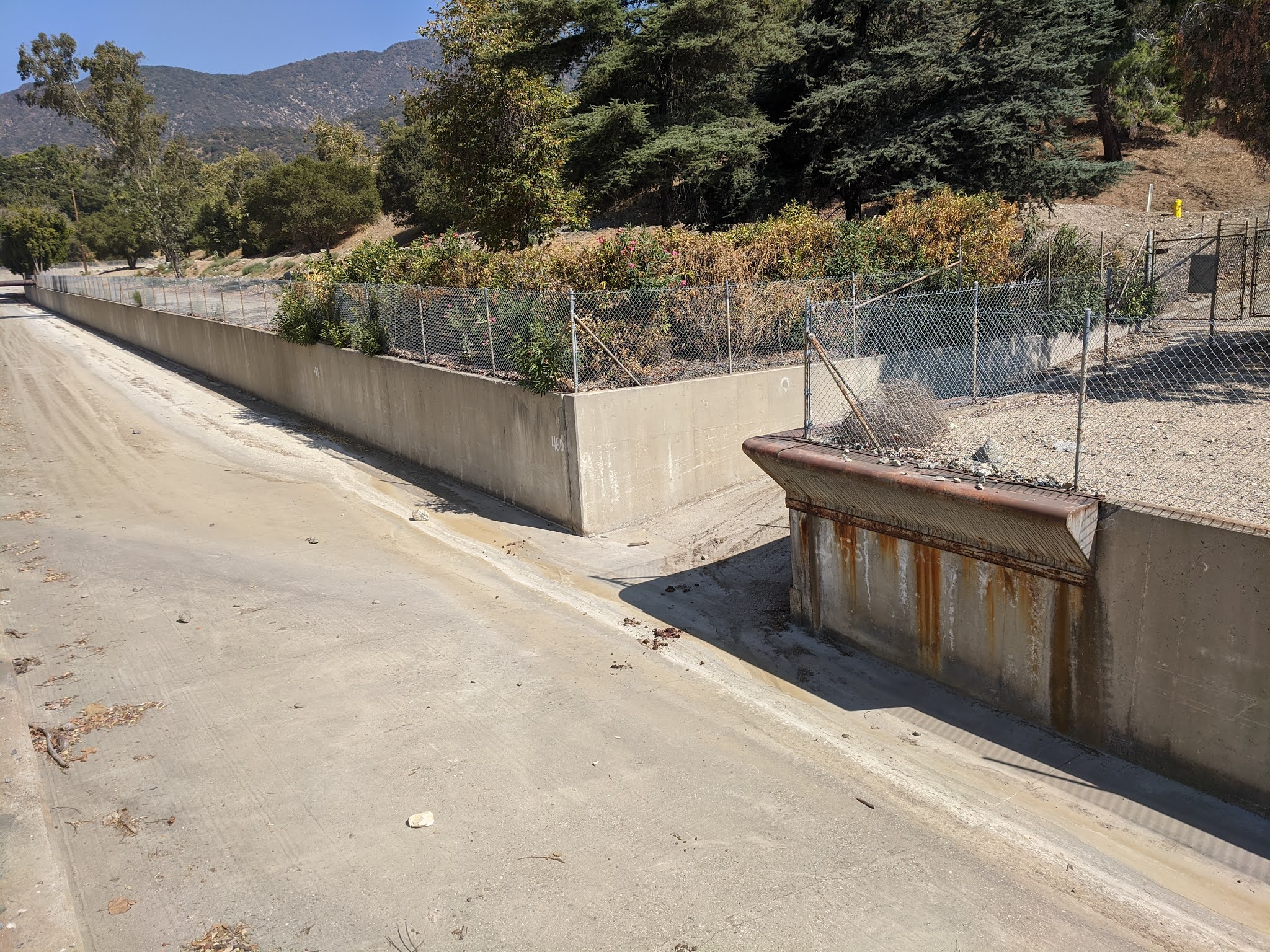 To get an idea of what I was looking at here, I first checked Google Maps. There, I saw that this channel was connected to the "Sawpit debris basin" via a concrete channel in "Sawpit Canyon."
