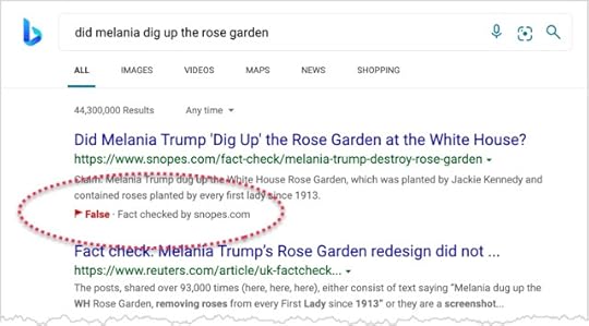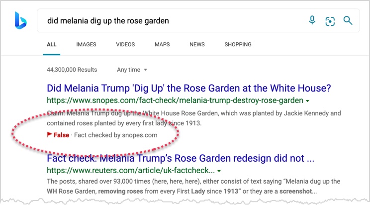 I also want to point out that Bing does a nice job of making their fact-checks very visible. Here, I added the red-dashed-oval, but the red False typography is Bing's.