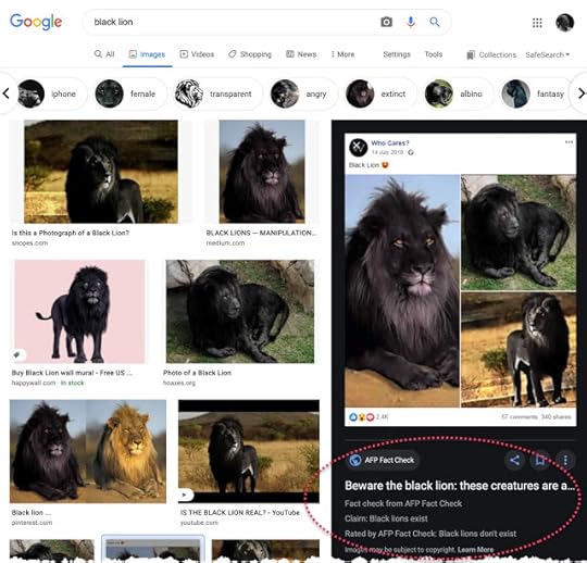 Here's an example of an Image search for the mythical [ black lion ]. Note the red dashed oval I added to the screengrab. Google adds in the "Fact check from AFP Fact Check" (which is one of the partners who verify such things).