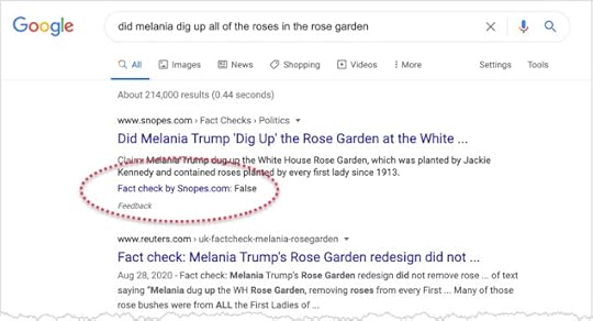 Here are some examples of fact-check labels when they appear. Since they’re sometimes not obvious, I’ve highlighted them so you’ll spot them next time you run across one in your searching.