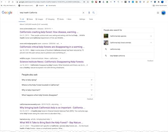 4. Pay attention to what's missing. To tell the truth, I didn't notice that the data for Southern California was missing in the first article. I was so excited about finding 20 years of data that I kind of overlooked the gap. It was only when I thought to check the kelp coverage in the Channel Islands (way down south) that I noticed the missing data. It wasn't hard to modify the query to find the [kelp health Southern California], but it would have been embarrassing to have missed half of the state!