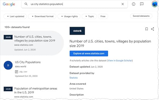 1. Dataset Search. We've talked about this new search product before (SRS Jan 24, 2020). It's a search tool that lets you search for different kinds of data sets. As you can see, a simple search gives pointers to many different datasets, each of which is hosted on the dataset provider's site.
