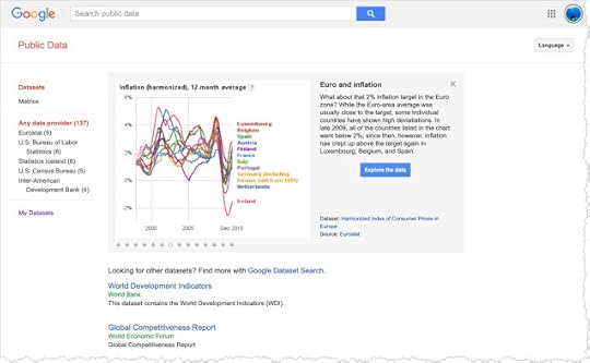 2. Public Data Explorer. We've talked about this before as well. (SRS July 3, 2010). It's a curated collection of data sets from a host of high quality sources. In this case, the data is hosted on Google servers, so even when the host is down (or updated), you can still get to the data.
