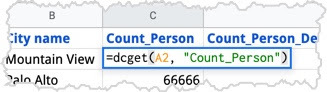 In this spreadsheet, I put the city names in the far left column, then wrote a couple short retrieval expressions and got the population of each city, the number of middle-schoolers in that city, and then computed the percentage of the city's population that's in middle-school. This is what those cell expressions look like: