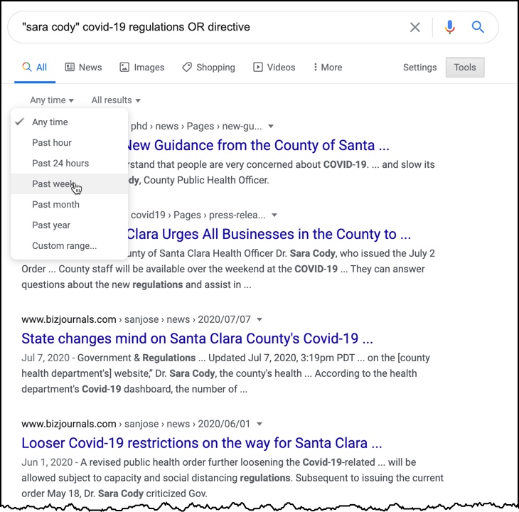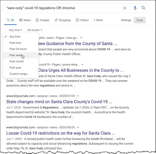 1. Time filtering lets you find current content. In the case of regulations and late-breaking information about pandemics, you certainly want to see the most current material. Be sure you know how to filter by "past 24 hours" "last month" or even better, "custom range."