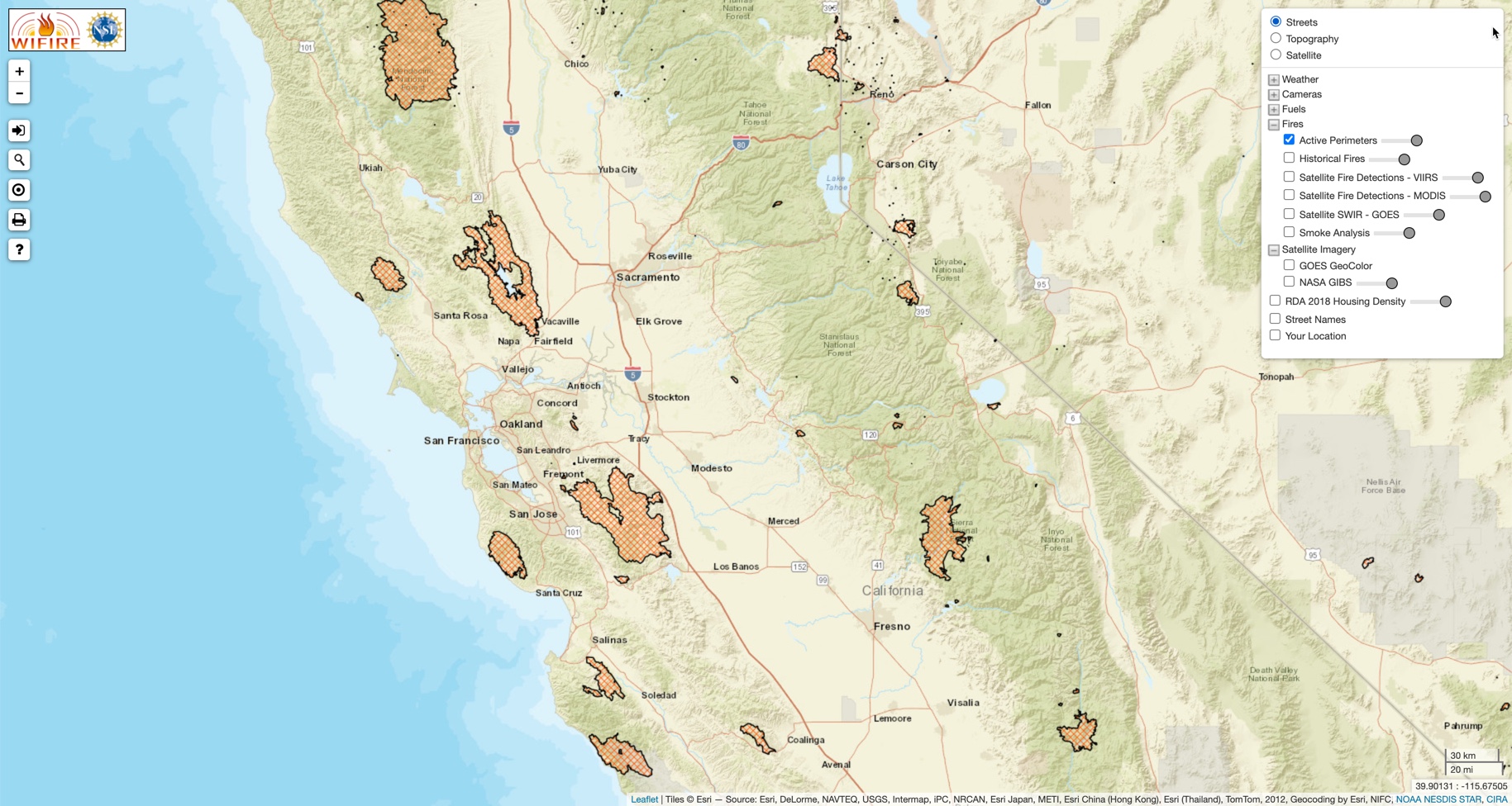 4. San Diego Supercomputer Center / NSF firemap. Another great map with many (and different!) layers that you can turn on/off. Use the layer selector widget in the upper right corner of the map. (Here I've turned on the fire perimeter map, but if you turn on the "housing density" layer, you can see part of the wildland/urban interface problem.)