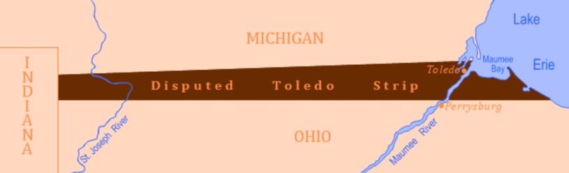 BUT, Michigan was then locked in the Toledo War over whether Ohio or Michigan would control the "Toledo Strip" (a rectangle of land on the border between Michigan and Ohio that ran from Lake Erie on the east to Indiana on the west). That strip of land happened to include the city of Toledo and access to the Maumee River.