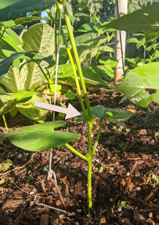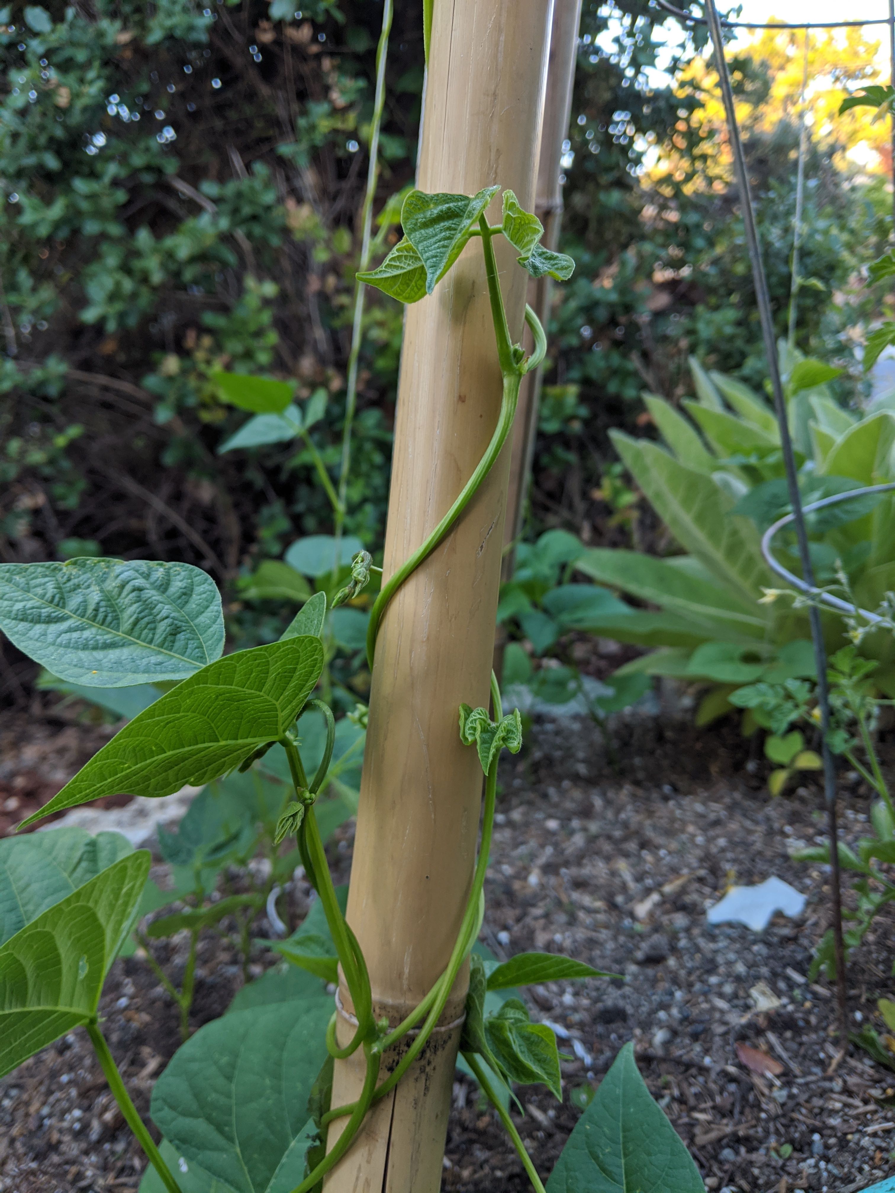 As you can see, the vine is climbing up the bamboo by wrapping itself around the pole. Eventually, it will climb to the top (12 feet, 4 meters), and maybe a bit beyond.