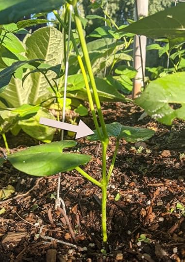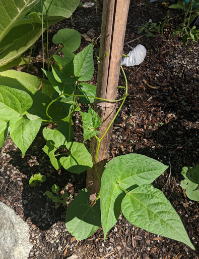 Of course, I have questions, in particular, I'm fascinated by the way the beans are growing up the poles. They're curling around the pole in the most amazing way. Here's a closeup of the tip of a bean plant wrapping around a support string: