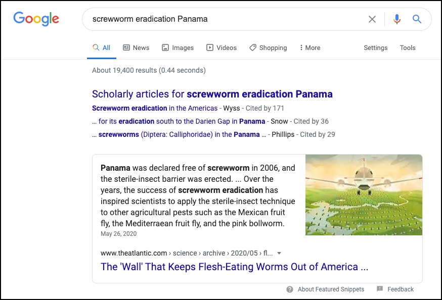 And quickly found an extract from a web page on this topic (see below). That inset block about screw worms (Cochliomyia hominivorax) is called a featured snippet, and shows a highlight from an article in the Atlantic on screw worms, and the surprising US program that keeps screw worms out of the US, Canada, and most of Mexico. (Farther down on that SERP are several other articles, including a recent one from National Geographic.)
