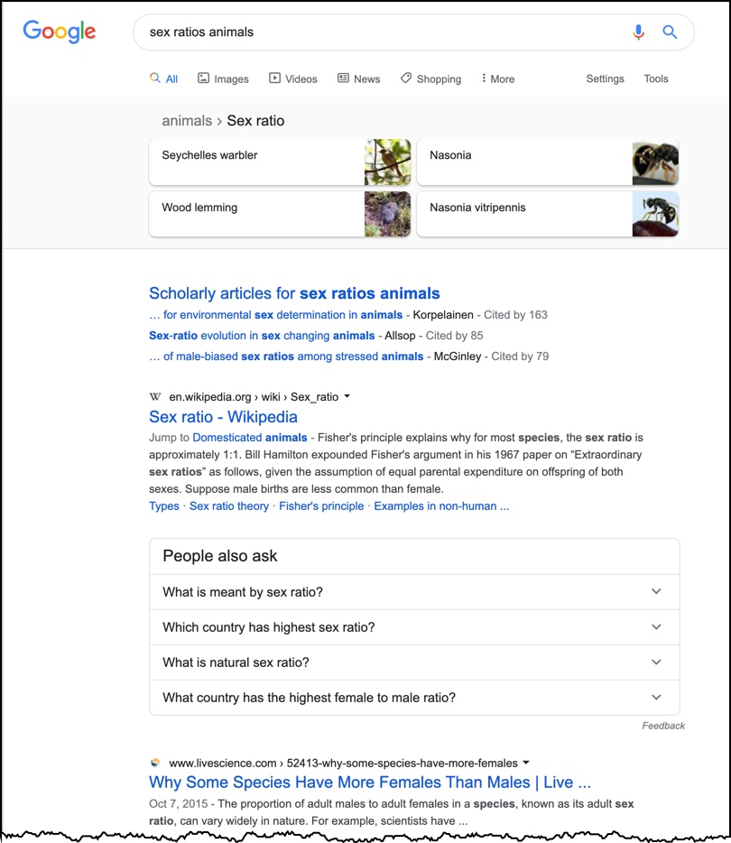 To do a quick scan, I did a bit of parallel browsing (see our earlier discussion), opening the top is 7 links, as well as all of the Scholarly articles, the Wikipedia article on sex ratio, and that LiveScience article about "Why some species have more females than males."
