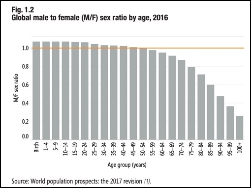 There is a significant shift in sex ratios among some animals by age. The most interesting example is that of humans. (These numbers are male/female.)