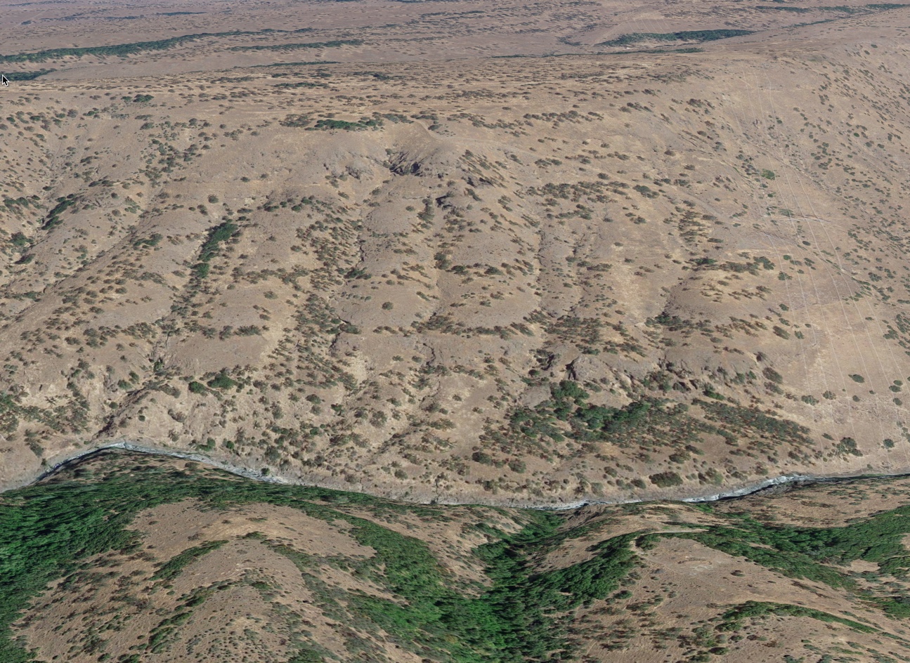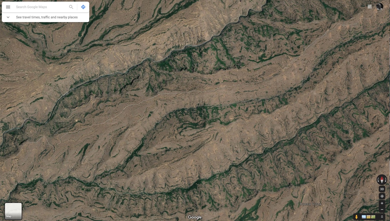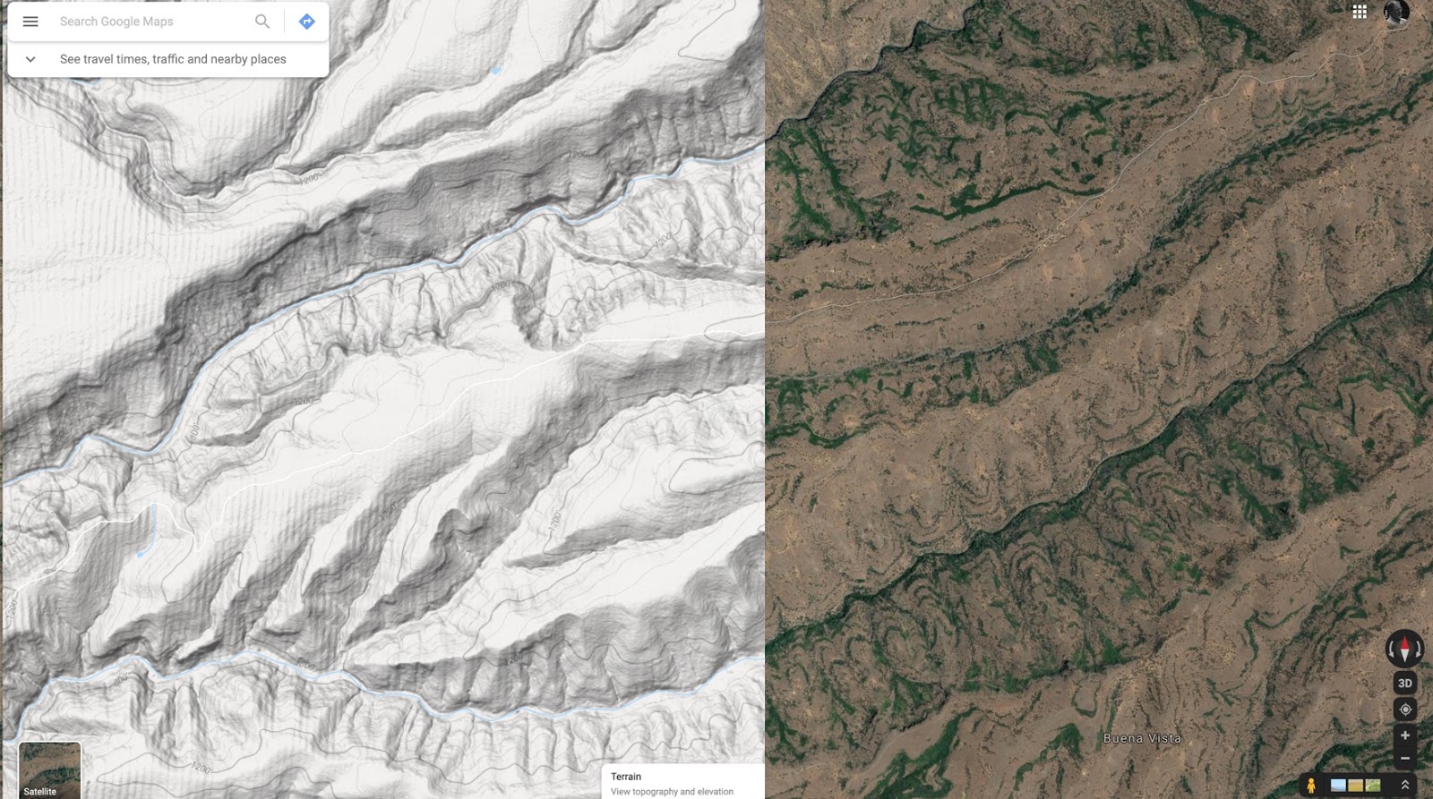The "contour lines" in the satellite photo are clearly lines of trees or bushes or something growing. This amazes me. I thought contour lines were an artificial construct, a visualization device mapmakers would draw on a map to give a sense of shape on an otherwise 2D image.