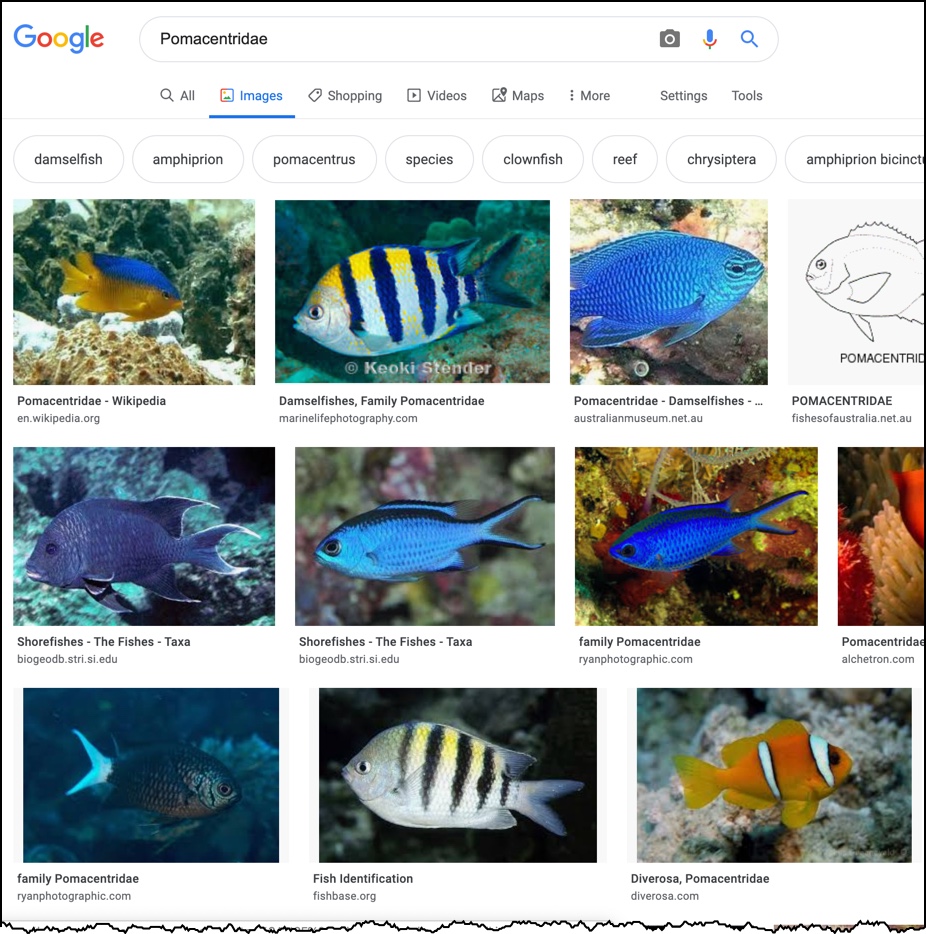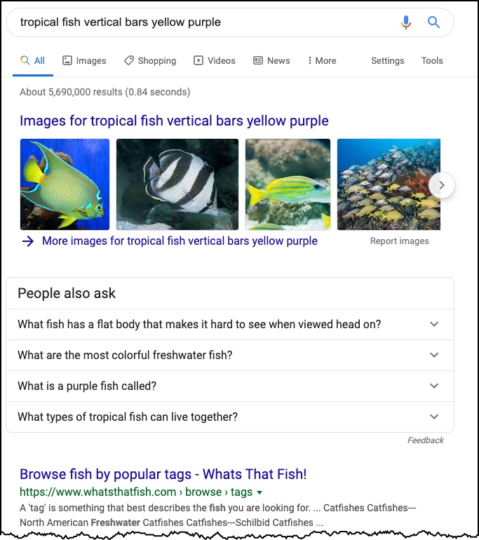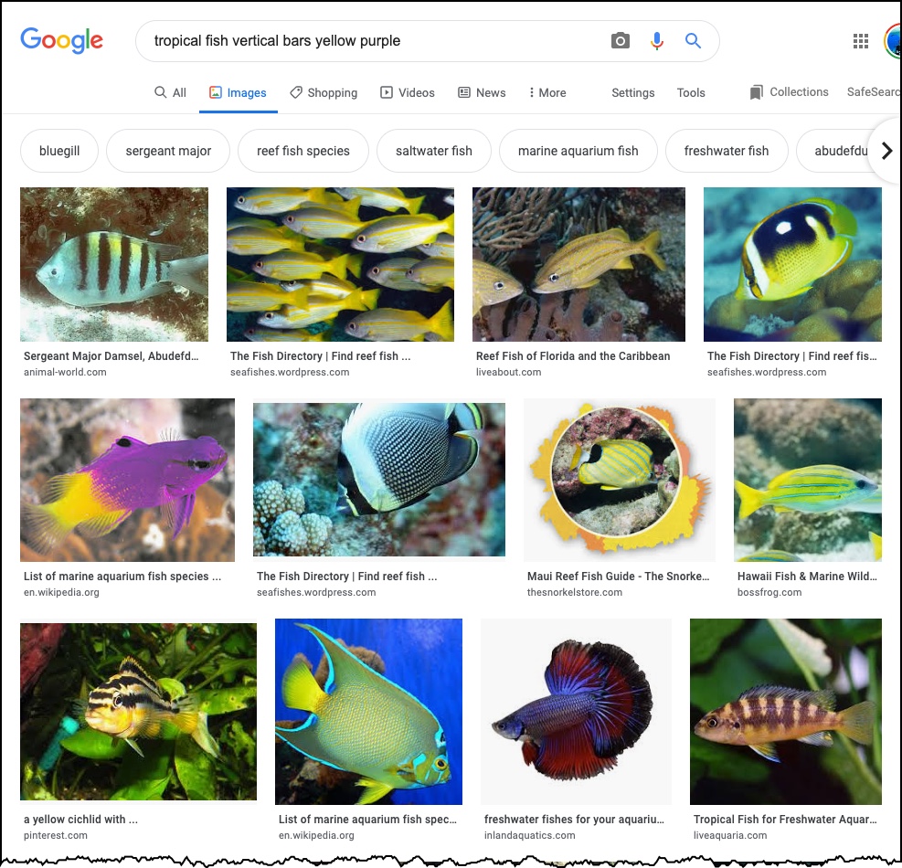 Today we're onto fish identification. We need to identify the fish above and the fish below. Using the information we have at hand, we KNOW it's a tropical fish (I said as much in the Challenge) and that it's somehow associated with purple.... something. (I called it a "haze." That's about as useless a term as you might want. Clearly, I don't know what the purple stuff is.) I thought I'd try doing it with just a simple query, then searching through some images to get a good match. My query was a simple description of what I see in the photo: [ tropical fish vertical bars yellow purple ] This is what I got... and it worries me. Looks like there are LOTS of fish with vertical bars...
