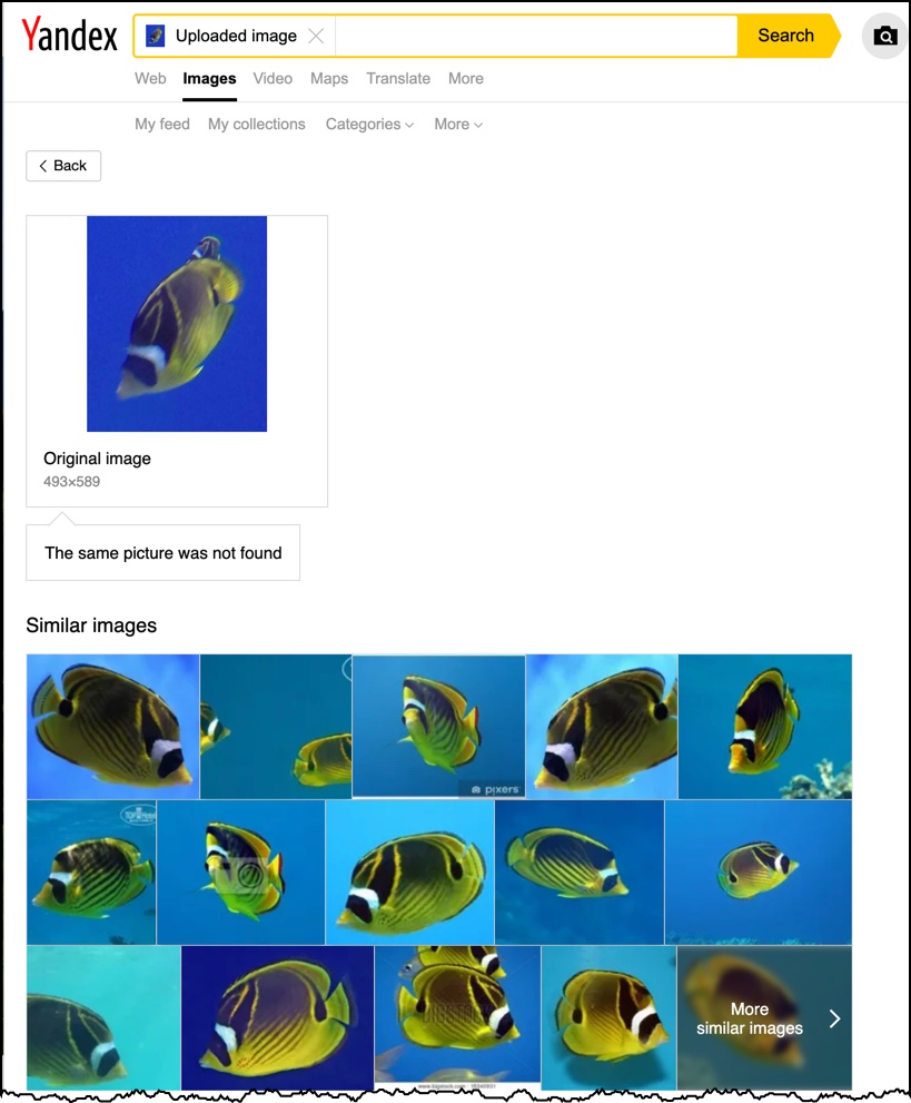 This time I went with trusty Yandex search on a cropped image. I took the above image and cropped it down to a single individual fish, like this: