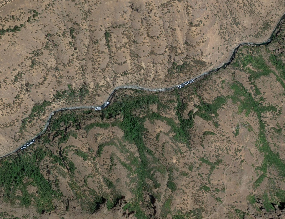 The first thing we need to do is to figure out what this place is called. When you look at it from the air, there aren't any handy labels. Even on the map, the only nearby named things are "Wells Place" and a few creek names, most notably "Mill Creek" (as seen above).