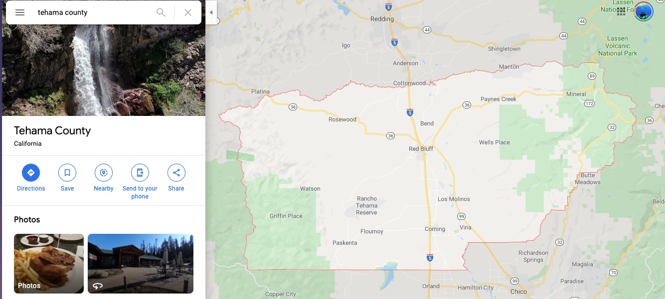 Why Tehama County? I know that in the US, the United State Geological Survey (USGS) often organize their content (e.g. lists of geological features) by county. A quick check of Google maps showed me that the boundary of Tehama County included our interesting location at 40.081801, -121.903088 (link to Google Maps at this location).