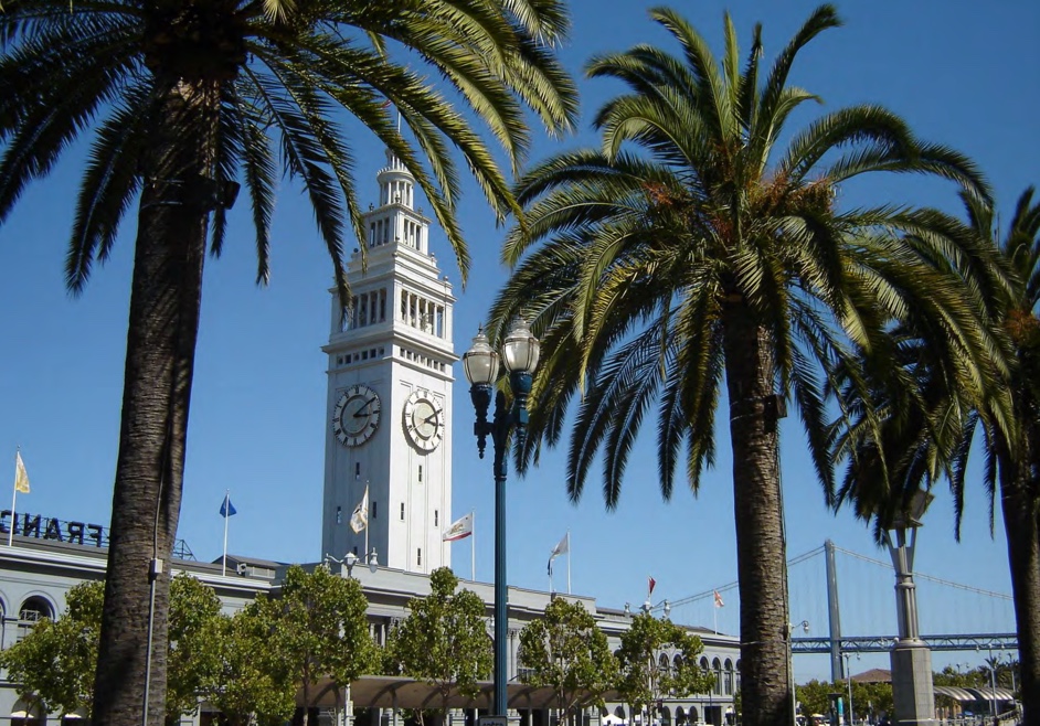 ... palm trees line the Embarcadero, the grand boulevard that wraps around the top of San Francisco.