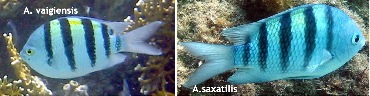 Both have 5 vertical bars, both have a yellow patch on the back--they're surprisingly similar. I did a search for: [ Abudefduf identification ] and found fairly detailed descriptions in FishBase.se (A. saxatilis and A. vaigiensis ), but the written descriptions are nearly identical. The biggest difference is their respective ranges. So perhaps we have to identify the other fish in the next image, figure out its range, and see where they overlap.