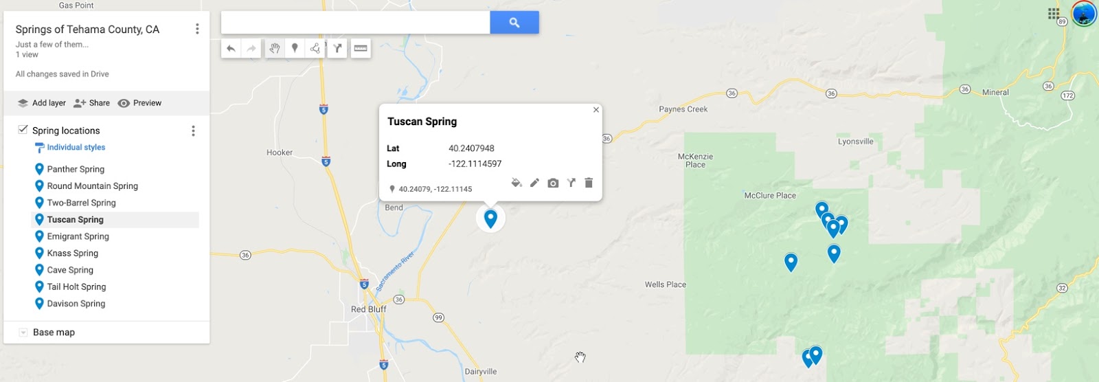 With all of those springs, I made a quick map of some Tehama County springs using Google's My Maps service. (link to my map)
