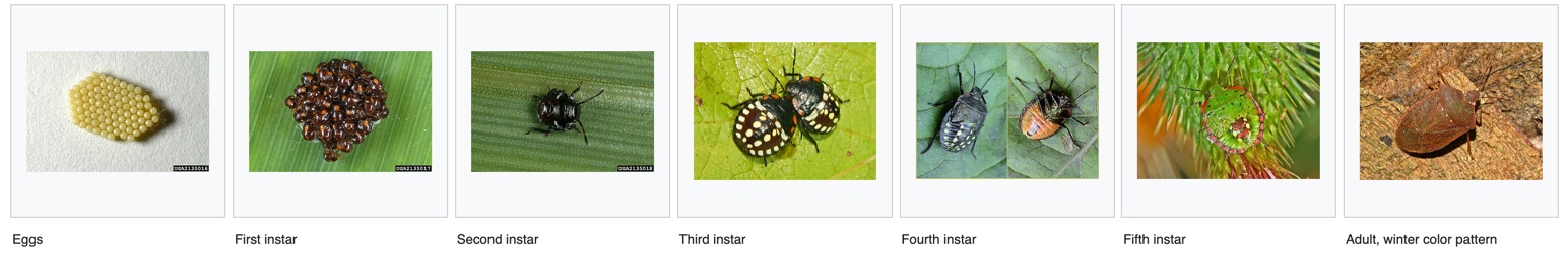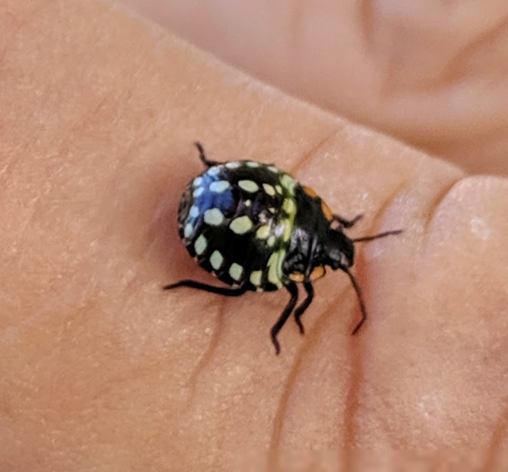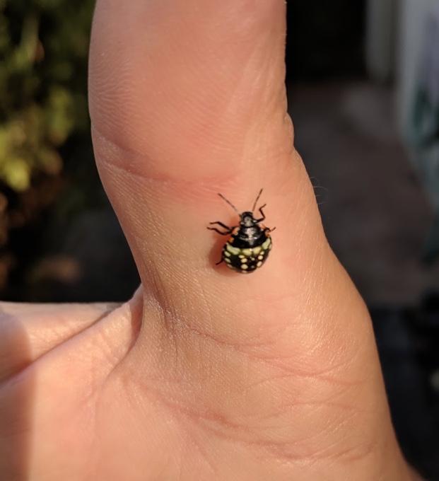 Even better is the next result (just below the screencap) from Wikipedia identifying this bug as a Nezara viridula . Specifically, this is the third instar nymph of this bug, known colloquially as a southern green stink bug (in the USA), southern green shield bug (UK) or green vegetable bug (Australia and New Zealand). It's a plant-feeding stink bug that goes through a number of developmental stages (known as instars). This developmental sequence from the Nezara viridula article shows the various stages really well. Take note of the 3rd instar--that's our bug. Same shape, same yellow dots, same orange dots on the shoulders. (Click on the image to see it full-size.) And that explains why I don't see them any more--they've all moved on to the 4th instar and are full adults (by now).