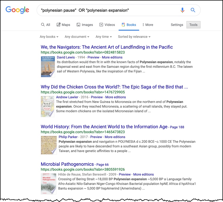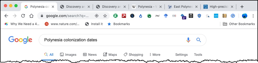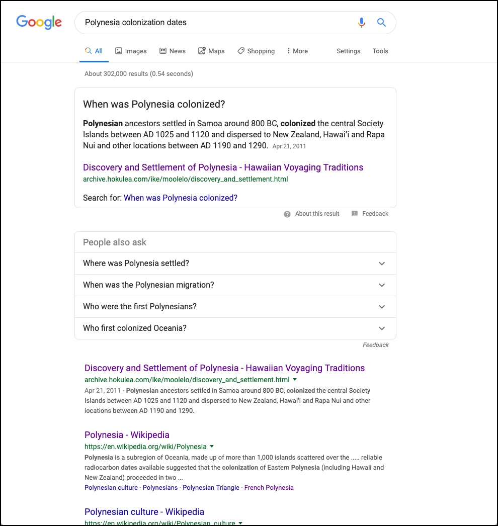 This sounds simple enough... but it turns out to be a bit of a contentious issue. As I discovered, there's a bit of debate about the dates I show above. Getting a definitive answer to this is probably a PhD's thesis worth of work (and there are people doing exactly that!), but let's see what we can do with our SRS skills. I started my research with this query: [ Polynesia colonization dates ] which gave me this SERP: