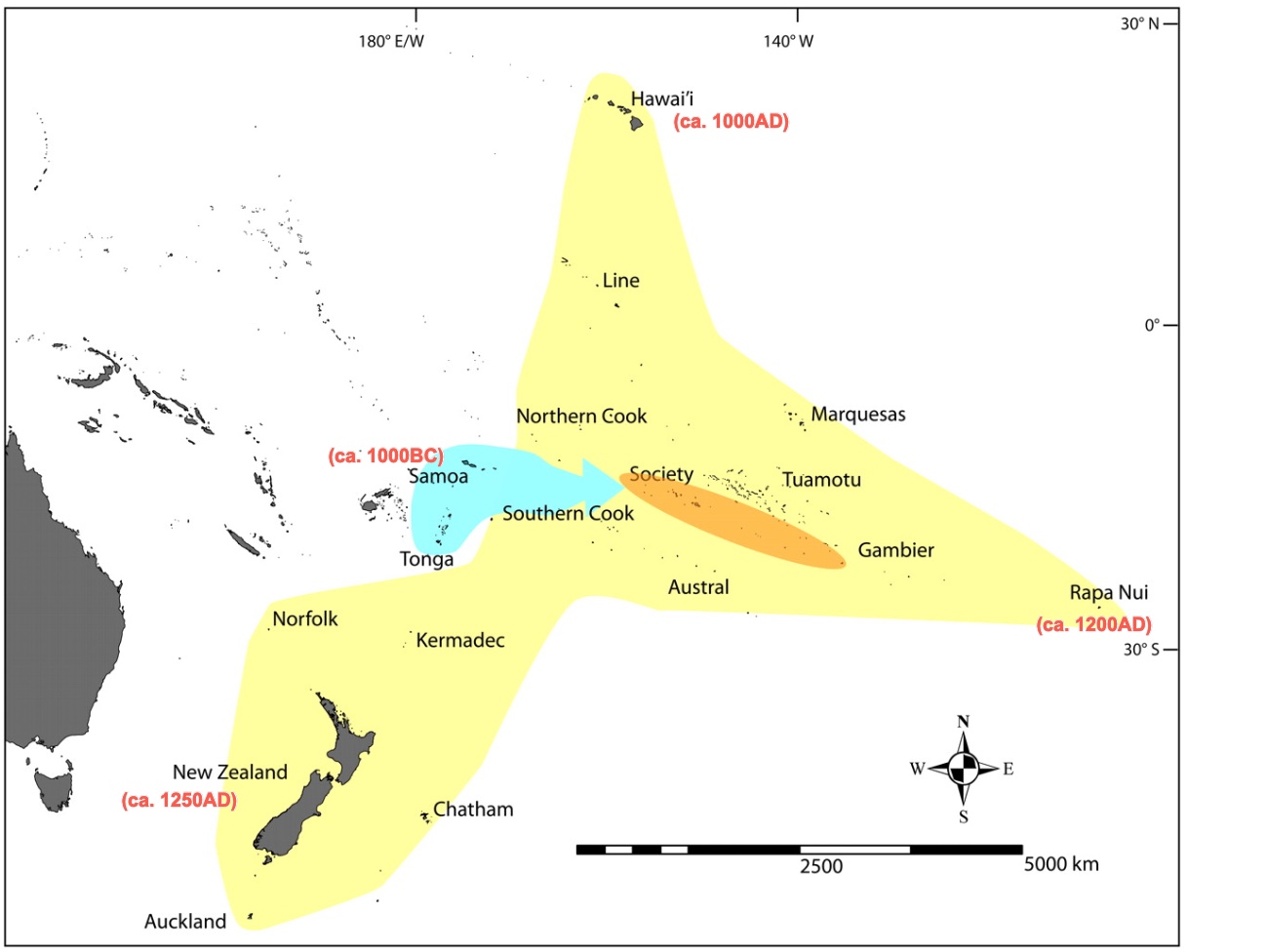 The first tab is from Hokulea.com (a Hawaiian cultural education site), the second is from Wikipedia, 3rd is from Phys.org (a science news site). Others I opened were from other science journalism sites. By reading about 10 such sites, I quickly learned that there's some disagreement about the exact dates for Polynesian island colonization. The root of the discussion is about the accuracy of the methods used in previous research. (There's a big discussion about the accuracy of the reported 14C measurements.) But after reading through many of these reports, the overall pattern still holds. The dates might be off by anywhere from 75 - 150 years, but the overall story remains the same. The precusors of the Polynesians moved from somewhere in southeast Asia to colonize the islands around Melanesia, stopping sometime around 1000BCE. (This model of expansion is supported by genetic, linguistic, and archaeological data. See: Wikipedia article on Polynesia; Proc. National Academy article about Polynesia colonization; Stanford summary of dates)Here's a visual map of this (modified from the PNAS article):