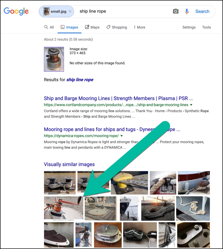 3. Modify a Search-By-Image by adding in additional terms that will provide context. This is an incredibly useful thing to remember when you're searching for an ambiguous target. In today's search, we added "ship" and "line" and "rope" and found what we were looking for. (I added "ship" to find only things associated with ships, then I added "line" because that's a common nautical term for a kind of rope, and then finally "rope" to find images that might not use the word "line.") That series of modifications (3 searches) made all the difference!