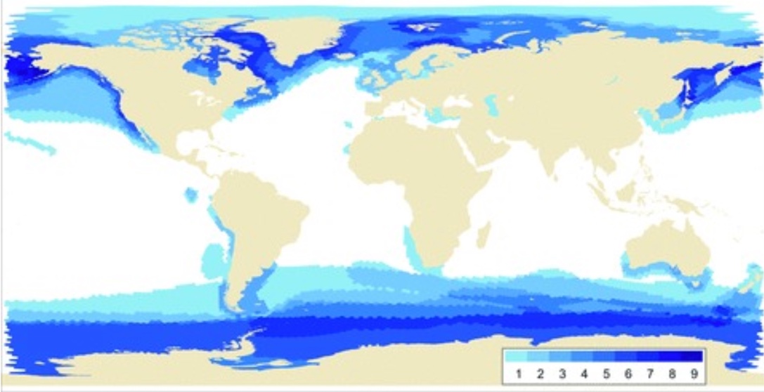 As you can see, pinnipeds are primarily cold water residents, with high population densities around the poles. Interestingly, the west coasts of North and South America are notable for their cold currents that skim along the shore. There are a few other outlier seal populations in the Mediterranean and Caspian sea. Generally speaking, the tropics are a seal-free zone! (Note, however, that blue streak in the middle of the Northern Pacific--that's Hawai'i, and a bit of a special case.)