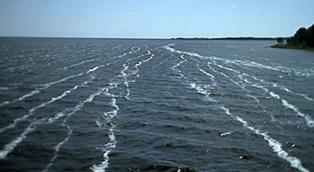 2. As we're sailing from place to place, it's not uncommon to see large patches of water without any ripples on the surface. It's something you see nearly everywhere--it's a common effect on lakes, ponds, and oceans. But what causes these ripple-free regions on the water? (See below for an image that has a large Y-shaped blank area in the middle. What causes this?)