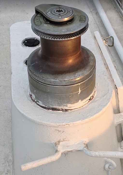 Then, by looking up what a winch was, learned there are two kinds of devices like this... it's either a winch, or a capstan--both of which look very similar. (The difference is that a winch is only used to tighten or loosen a line, while a capstan can lock the line in place. You use a winch to raise/lower sails, but you can use a capstan to tie your boat to a mooring point.)