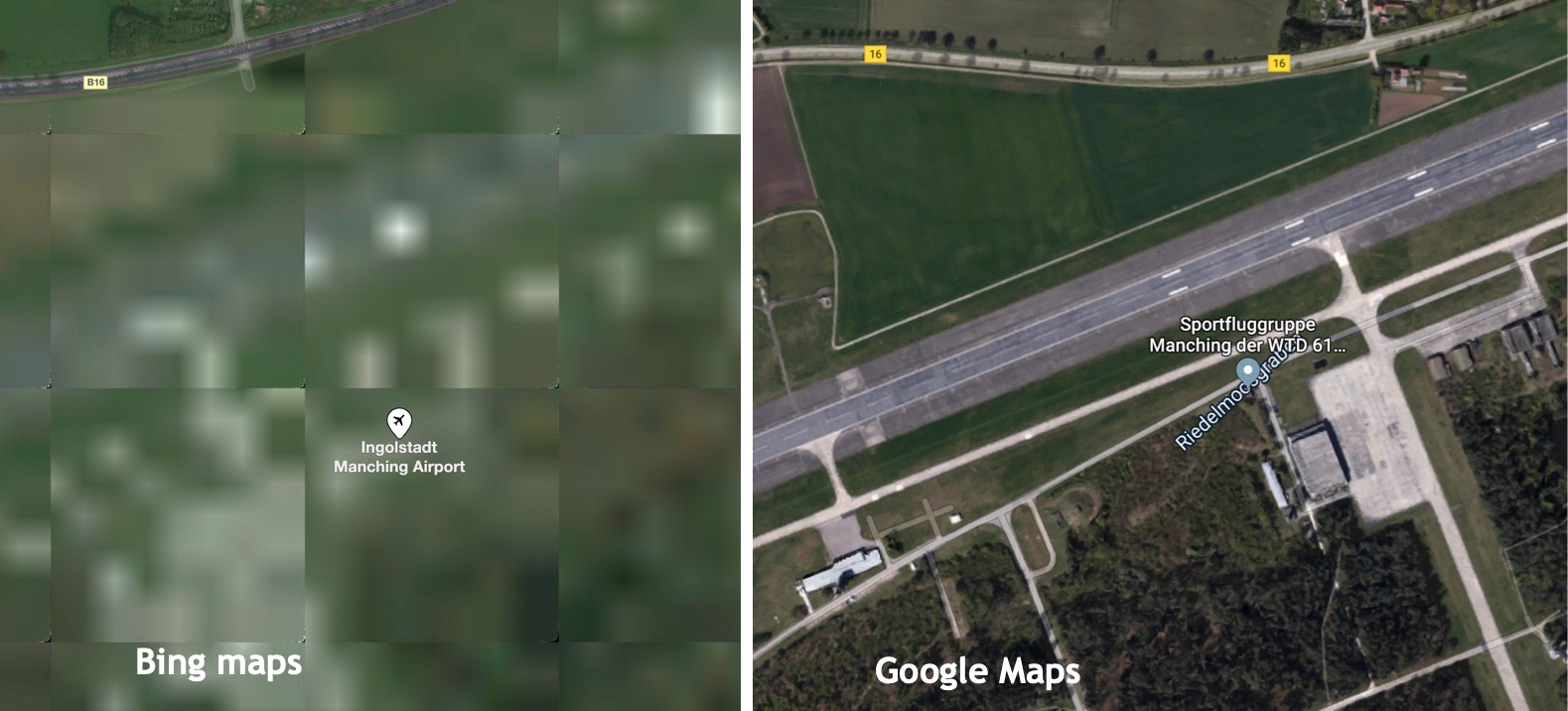 For me as a SearchResearcher, the value of all these different maps is that I can get very different views of a place. That's particularly useful when you're looking at places that some people want to be un-photographed. Sometimes one service has it in clear view while another has it obscured, as is the case with Ingolstadt Airport, Germany. (Note to the reader: Here it's one way obscured; there are places where it's the other way around.)
