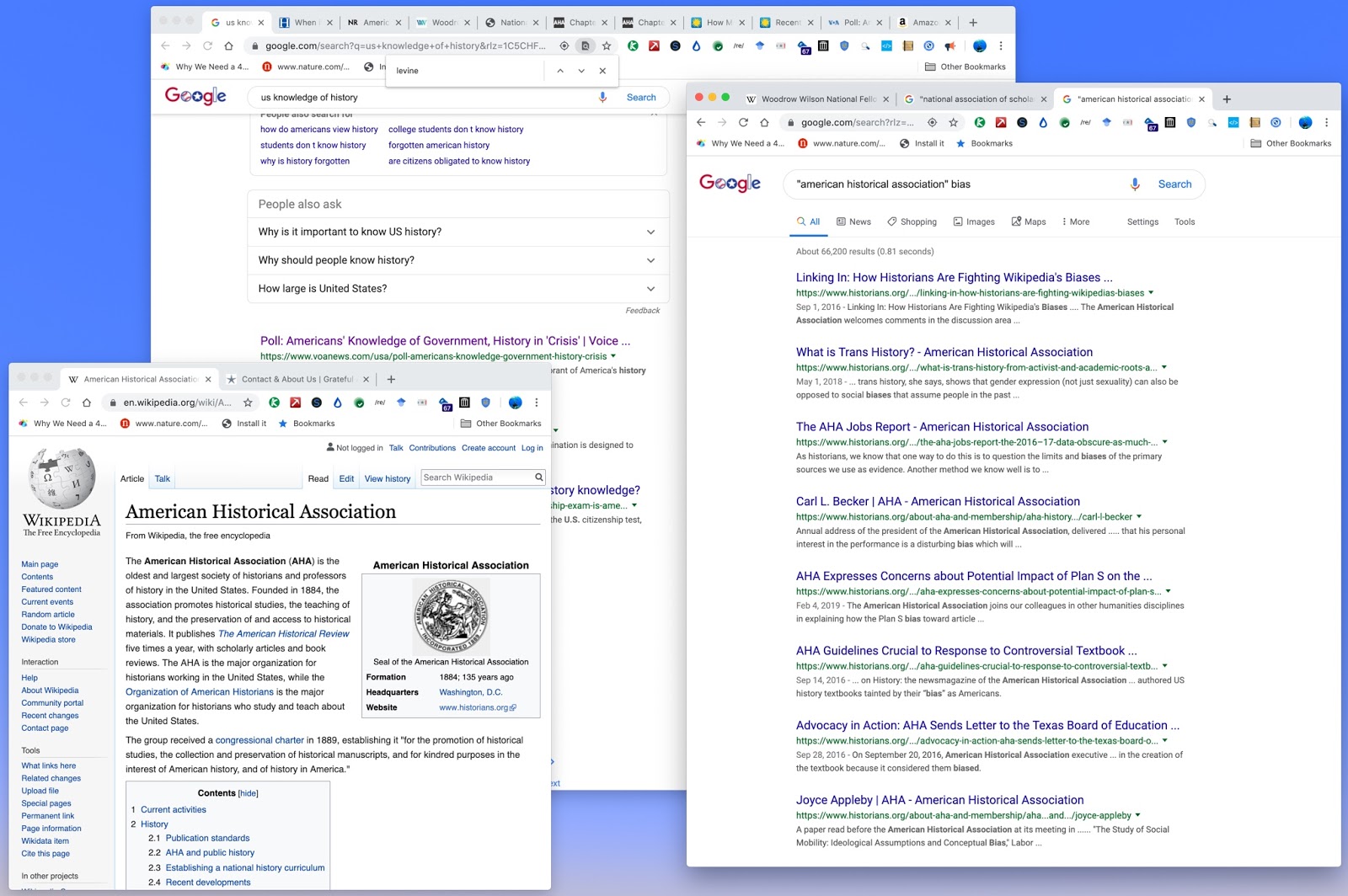 Let's do a quick rundown of these sources. The best way I know to do this is to (1) go to the organization's home page and do a quick overview scan; (2) search for the name of the organization, looking for articles about the org from other sources (and points of view); (3) search for the name of the org along with the keyword "bias." Here's an example of what my screen looks like when I'm in mid-review, in this case, I'm checking out the American Historical Association (that is, Historians.org)...