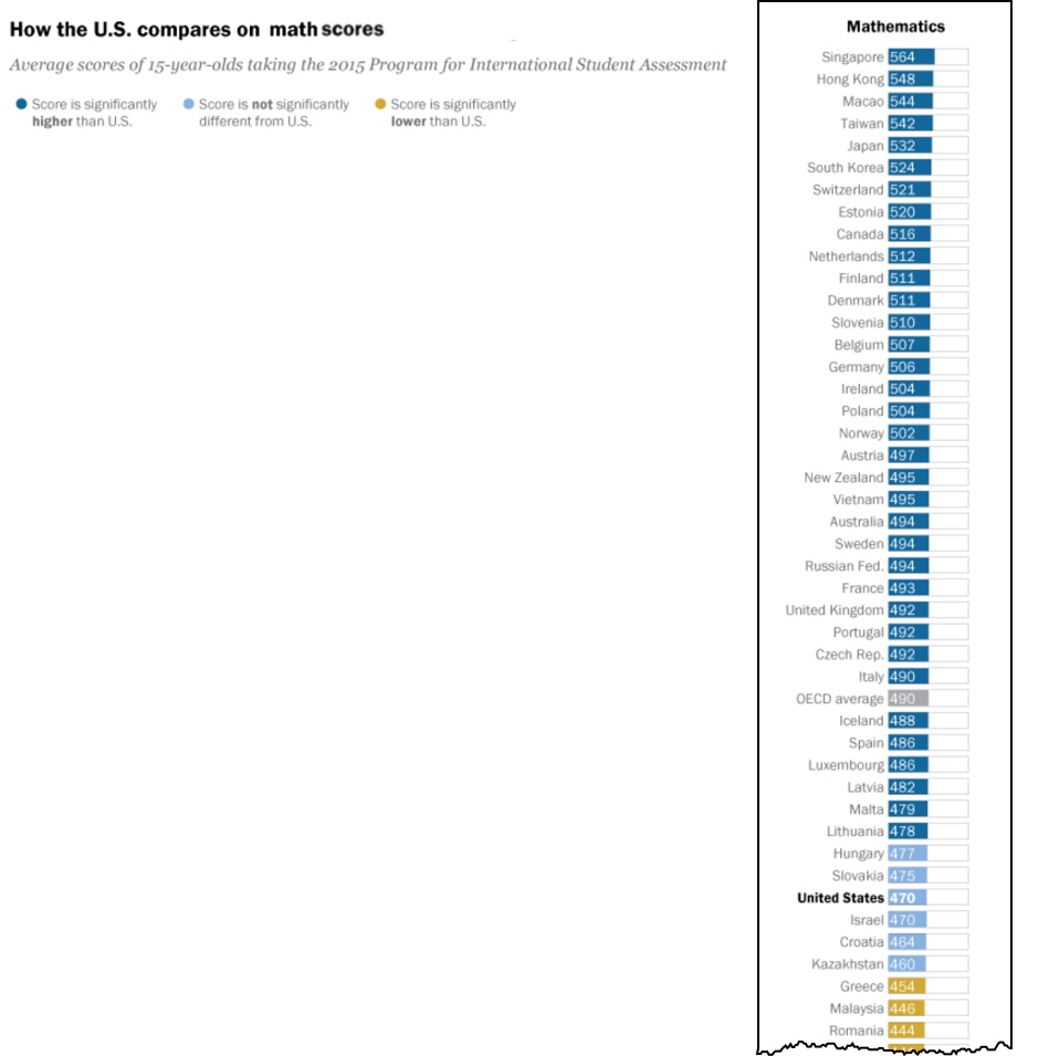 The US position in world math test scores. Data from PSA, chart by Pew Reearch.