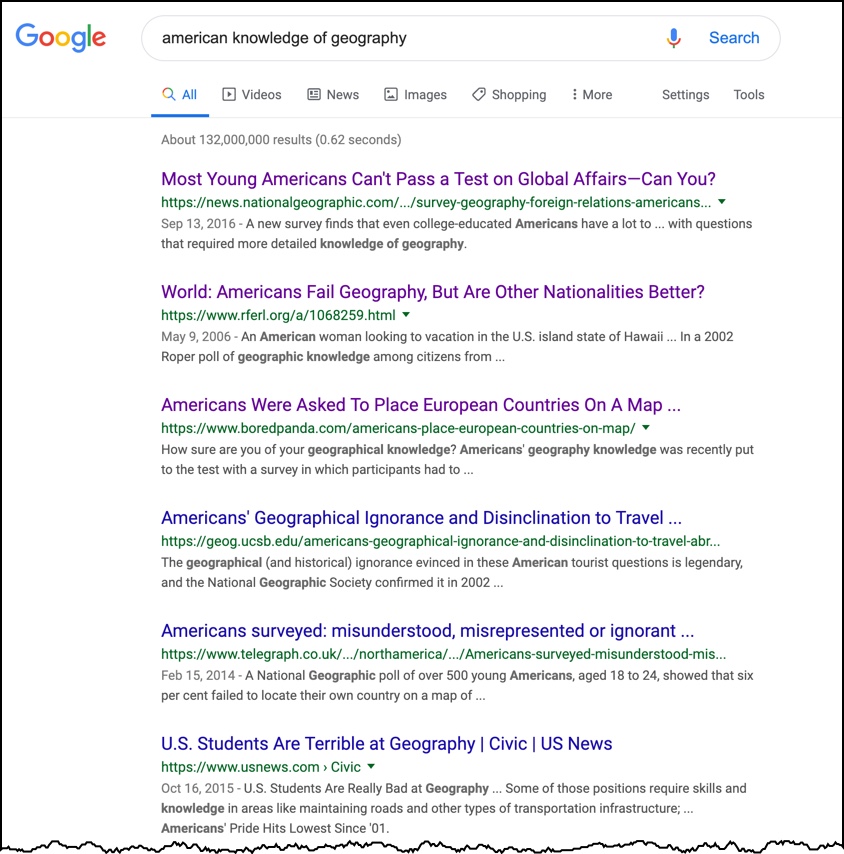 The first article is from National Geographic, a well-known (and highly reputable) source of geographic information. They cite a survey done for them by the Council on Foreign Relations about "What College-Aged Students Know About the World: A Survey on Global Literacy." The upshot?