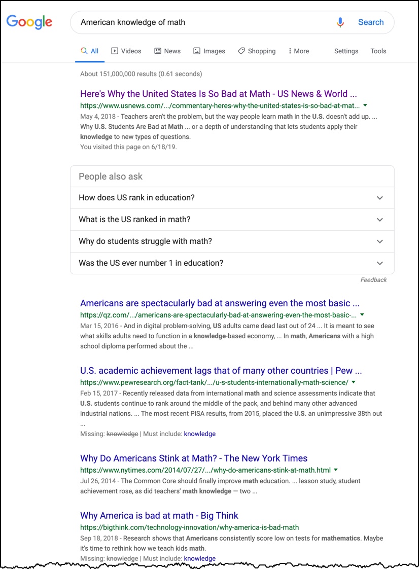 I could go on here, but you get the point. Of the top 10 results on the SERP, 10 had bad news about the state of math education in the US. Many of the results are from reputable sources, they expose their testing methods, and they share their data sets. The evidence is pretty overwhelming--the US is not doing a great job teaching mathematics to their students. There's much to do here in teaching our students how to do math.