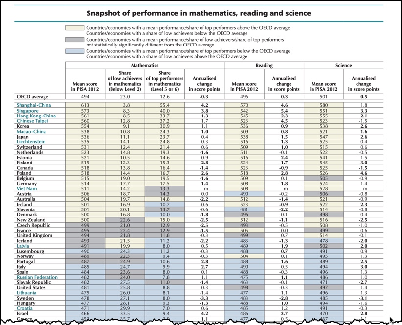 "Shanghai-China has the highest scores in mathematics, with a mean score of 613 points – 119 points, or the equivalent of nearly three years of schooling, above the OECD average. Singapore, Hong Kong-China, Chinese Taipei, Korea, Macao-China, Japan, Liechtenstein, Switzerland and the Netherlands, in descending order of their scores, round out the top ten performers in mathematics..."