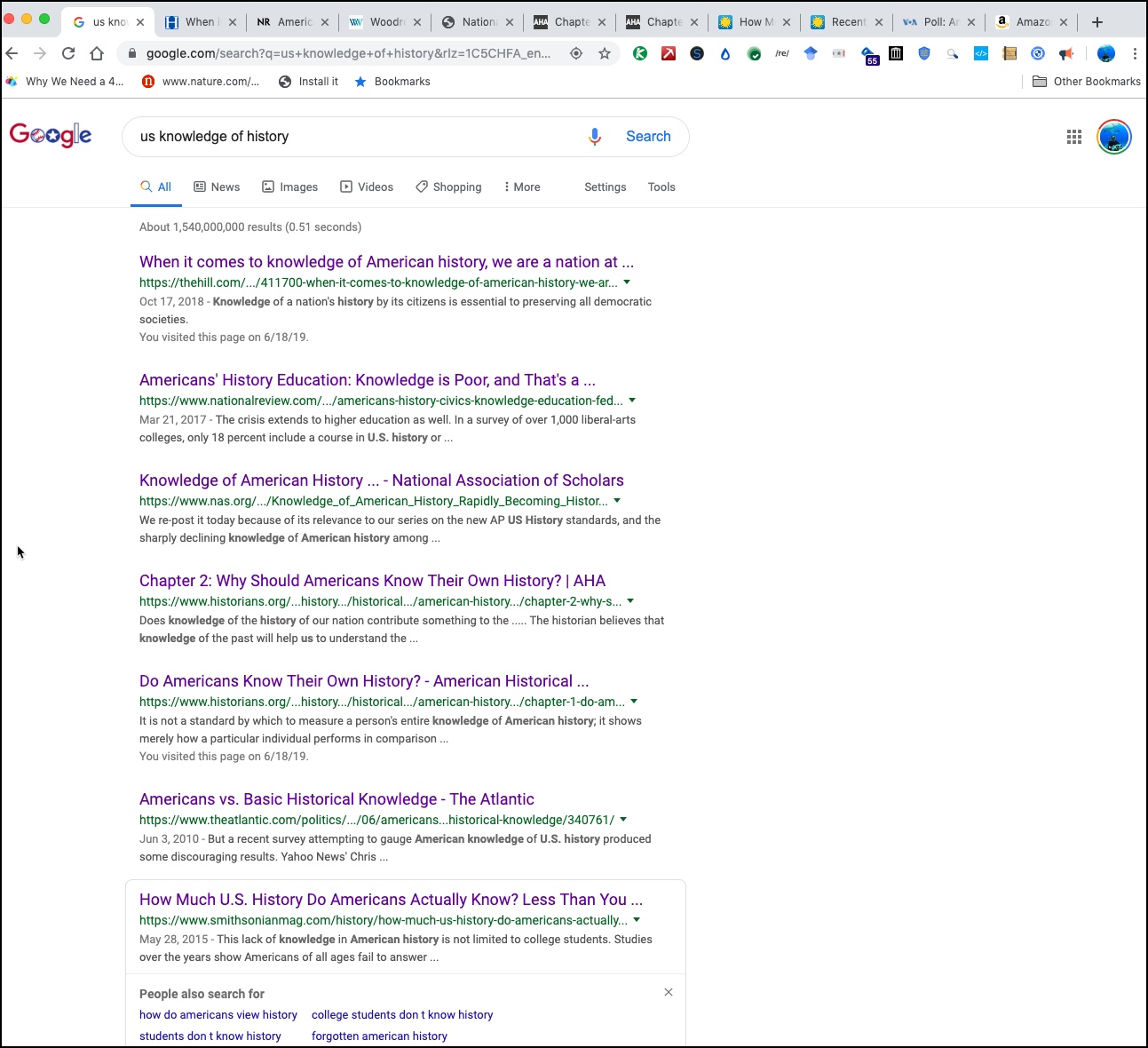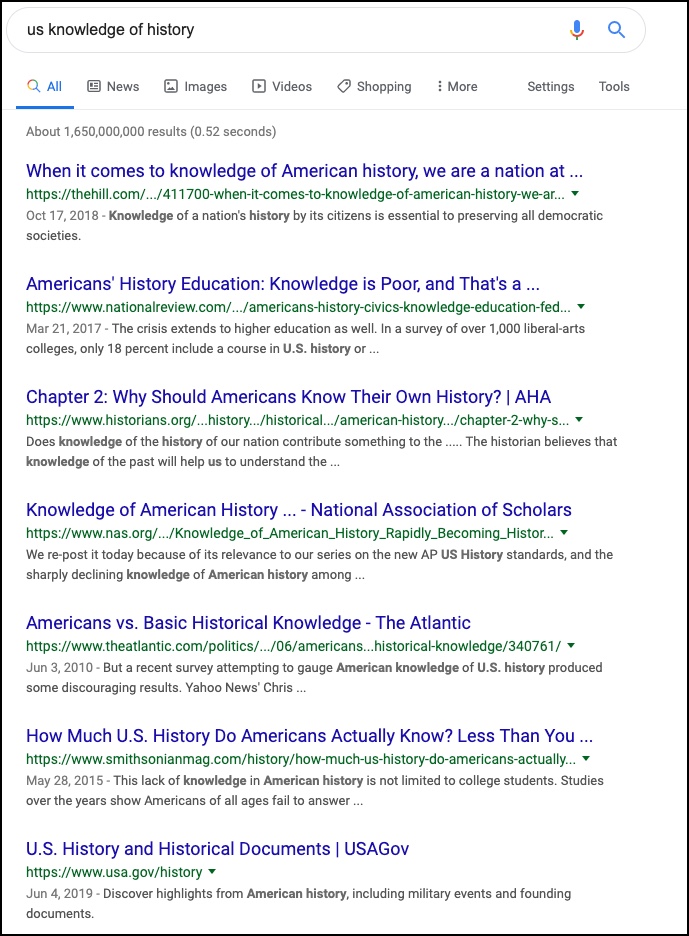 Now, I can look at a bunch of these results and compare them. But, as always, you want to scan the result AND check for the organization (and author). For instance, in the above SERP there are results from TheHill.com, NationalReview.com, NAS.org, Historians.org, TheAtlantic.com, VOANews.com, and SmithsonianMag.com