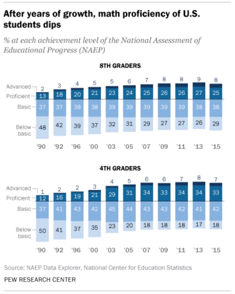 3. The Pew Research Center's report, "U.S. Students' academic achievement still lags that of their peers in many other countries" also points to the OECD / PISA study AND several others, giving a nicely integrated overview of the data. They put a slightly more optimistic spin on the data. They tell us that American students' math skills have increased over the past according to the NEAP scores from 1990 - 2015, although there seems to be a small tailing off in 2015...