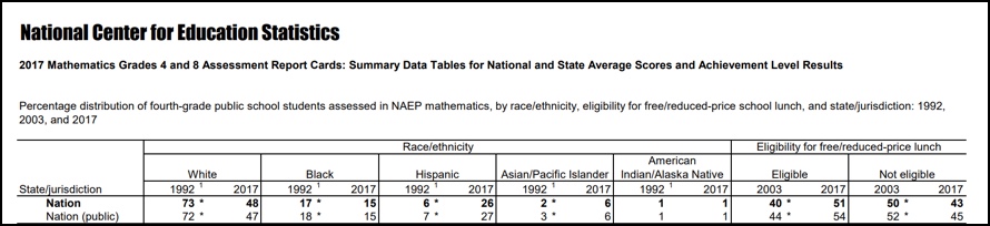 1. US News and World Report "Why students are bad at math" -- points us to the 2017 National Assessment of Education Progress. We've seen this data source before in our previous post. This org is also called NAEP and this report is called "The Nation's Report Card," and summarizes the results of testing across a wide spectrum of US schools for grades 4, 8 and 12. (I'm alway encouraged by a data source when you can download the data for yourself. Open data is a sign of a reputable organization, one that's willing to let you look at the raw data source.) Here's their 2017 Math data set in PDF form. Here's the top line of that report. (If you're interested, it's worth looking through the data for all of the metadata about their testing methods, and all of the data exceptions--which all data sets have, but which give me confidence that they took good care collecting this data.)