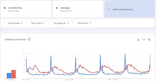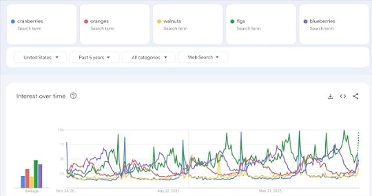 Suppose we want to understand the search relationships between cranberries oranges walnuts figs blueberries. Here's that chat on Google Trends for the past 5 years.