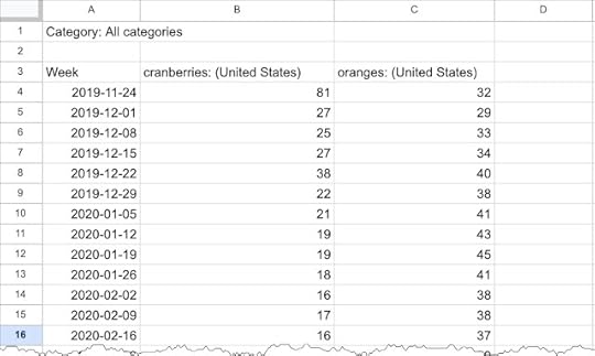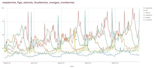 That's a complicated chart, but notice the seasonal effects of cranberries and oranges. Figs have a seasonality, but it's more complicated. (I leave that to you to figure out why!)