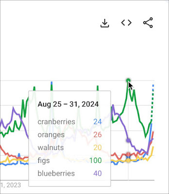 Now, to add in another seasonal fruit, we have to figure out which fruit scores 100 somewhere in this chart. If you look carefully, it's a toss-up between blueberries and figs. BUT.. by scrubbing your mouse over the data (or looking at the CSV) you can find that the high point is figs for the period Aug 25-31, 2024, so figs will become our common baseline. Every Trends analysis we run has to include figs so they will be comparable.