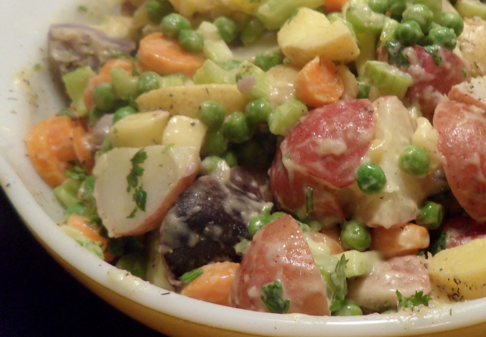 Still looking for your Fourth of July side? May not be too late to add my freaking awesome salad to the menu. It's not traditional potato salad--traditional potato salad is loaded with carbs and cholesterol, and not many people like it. This one still has that potato charm, but lots of veggies to make it healthier. The light vegan mayo dressing is virtually guilt-free.Ingredients for 6-8 servings