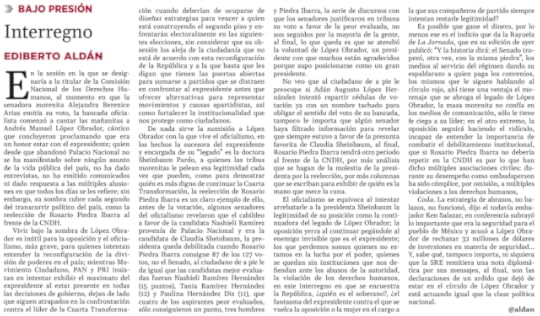 En la sesión en la que se designaría a la titular de la Comisión Nacional de los Derechos Humanos, al momento en que la senadora morenita Alejandra Berenice Arias emitía su voto, la bancada oficialista comenzó a cantar las mañanitas a Andrés Manuel López Obrador, cántico que concluyeron proclamando que era un honor estar con el expresidente; quien desde que abandonó Palacio Nacional no se ha manifestado sobre ningún asunto de la vida pública del país, no ha dado entrevistas, no ha emitido comunicados ni dado respuesta a las múltiples alusiones en que todos los días se les refiere; sin embargo, su sombra cubre cada segundo del transcurrir político del país, como la reelección de Rosario Piedra Ibarra al frente de la CNDH.
